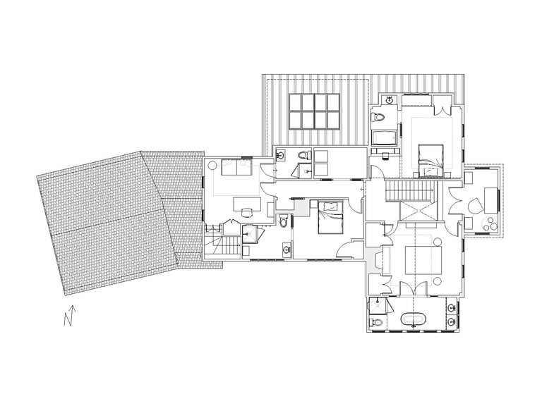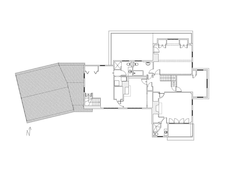 The second floor was reconfigured to align bathroom locations with bedroom adjacencies. Cathedral ceilings were introduced throughout the attic level where the structure permitted. The powder room, previously situated in a position that defied practical use, was relocated within a more considered area of the plan. The original hearth locations were preserved, maintaining the living room and sitting room in their existing positions while the surrounding layout was reconstructed around them.