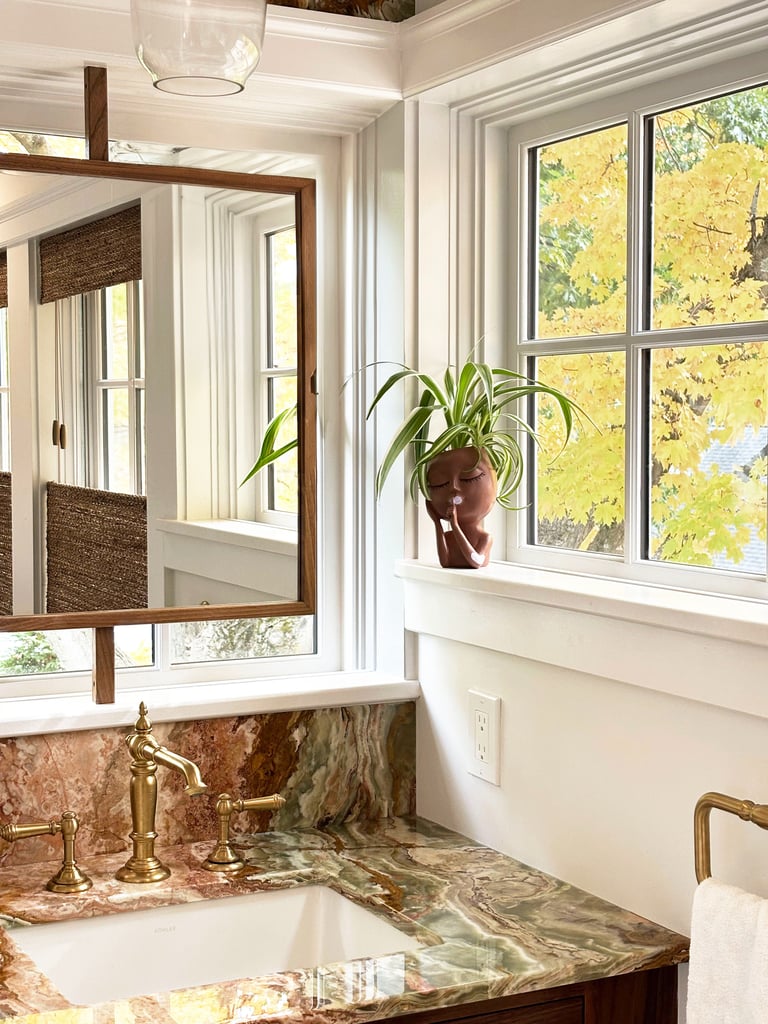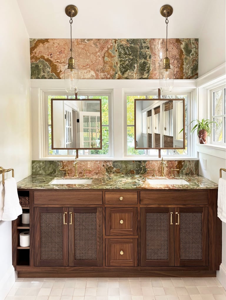 The south-facing deck off the master bedroom was removed, and the footprint was enclosed to create the master bathroom addition. The new volume, vaulted and flooded with light through three windows surmounted by a Palladian arch, accommodates a freestanding soaking tub, a custom walnut double vanity with cane-front cabinetry, and a full-height backsplash in green-and-rose onyx. The mirrors were positioned directly in front of the windows: natural light reaches the vanity plane without obstruction throughout the day. From the exterior, the addition reads as continuous with the existing sunroom below and with the existing roof line above, correcting a formal imbalance that had long detracted from the street facade.