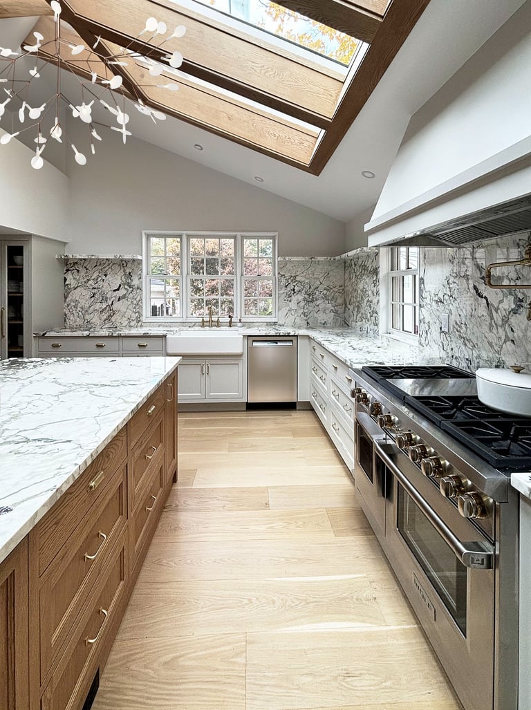 The kitchen was relocated to the north wing of the house, a position that afforded exterior exposure on two sides and made it possible to remove the deck structure above. The freed roofline was redesigned as a sloped ceiling with a custom oak-framed skylight grid, resolving both the ceiling height and the absence of natural light in a single move. The new kitchen receives light from two walls and from above. The Breccia Capraia marble, used continuously across the island surface and the full-height backsplash, anchors the composition. The cabinetry and Wolf range are subordinate to the stone, which functions as the primary material presence in the room. A pantry and a bar, transitioning into the formal dining room, complete the sequence. The exterior language of the Colonial Revival was maintained across the new roofline geometry.