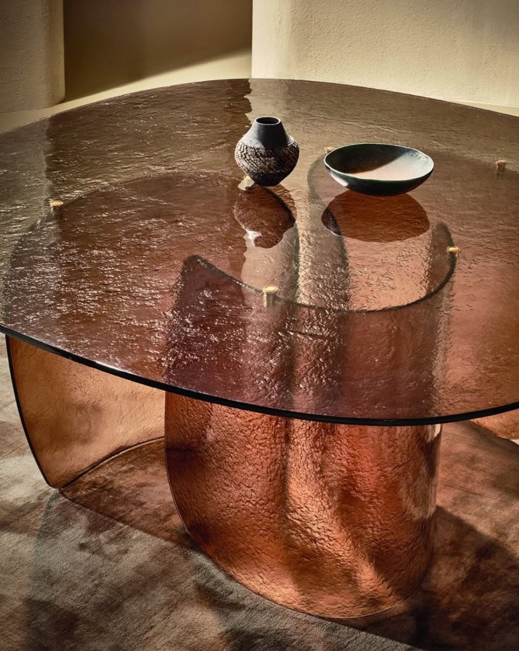 The table we chose is the Blur by Naturedesign, designed by Gino Carollo. The top is cast textured glass, not ordinary glass, but a material that captures and refracts light, creating luminous effects that shift as the day moves. The base is soft and fluid, curves that feel inevitable rather than designed, like the table arrived at its own shape naturally. It does not scream for attention, it commands it.